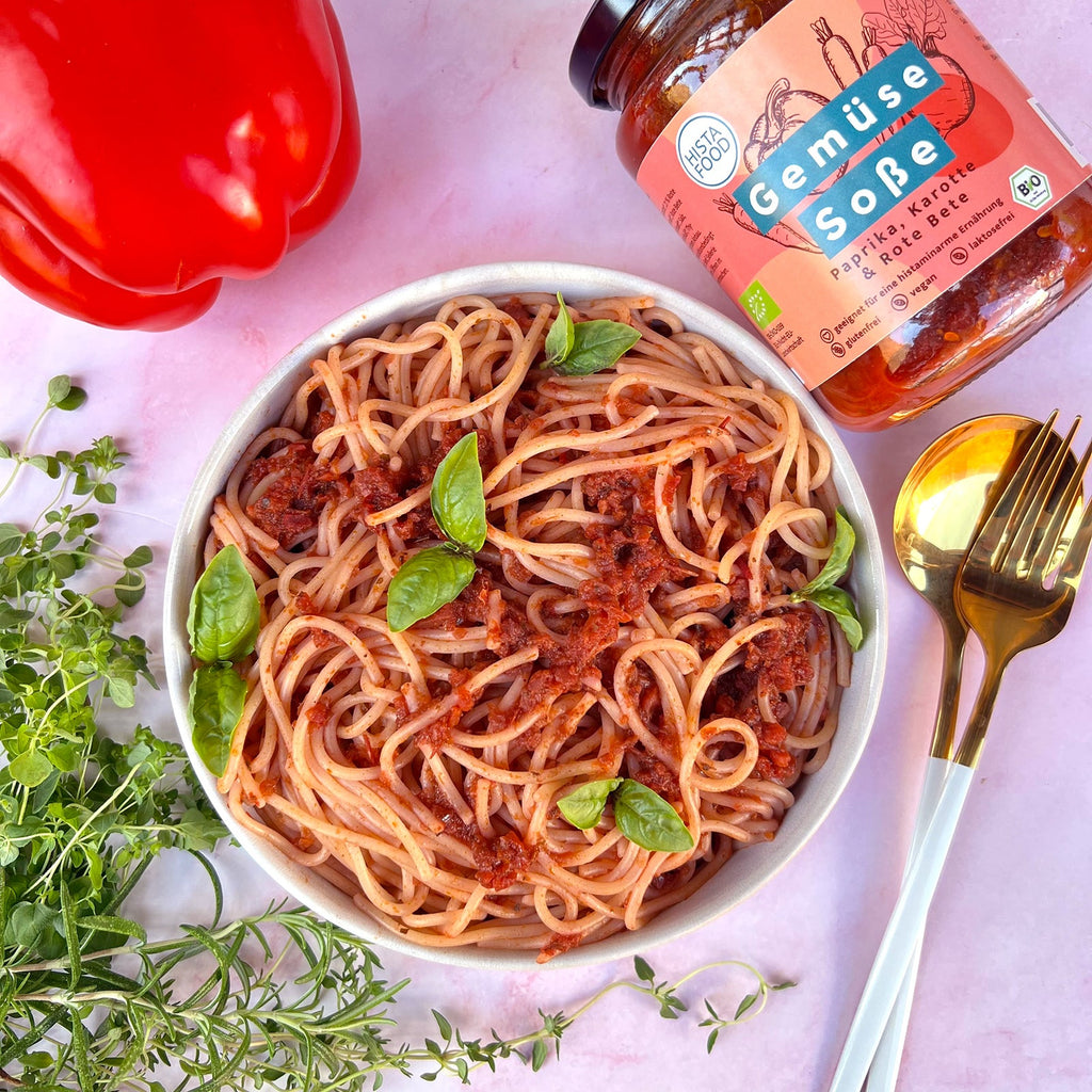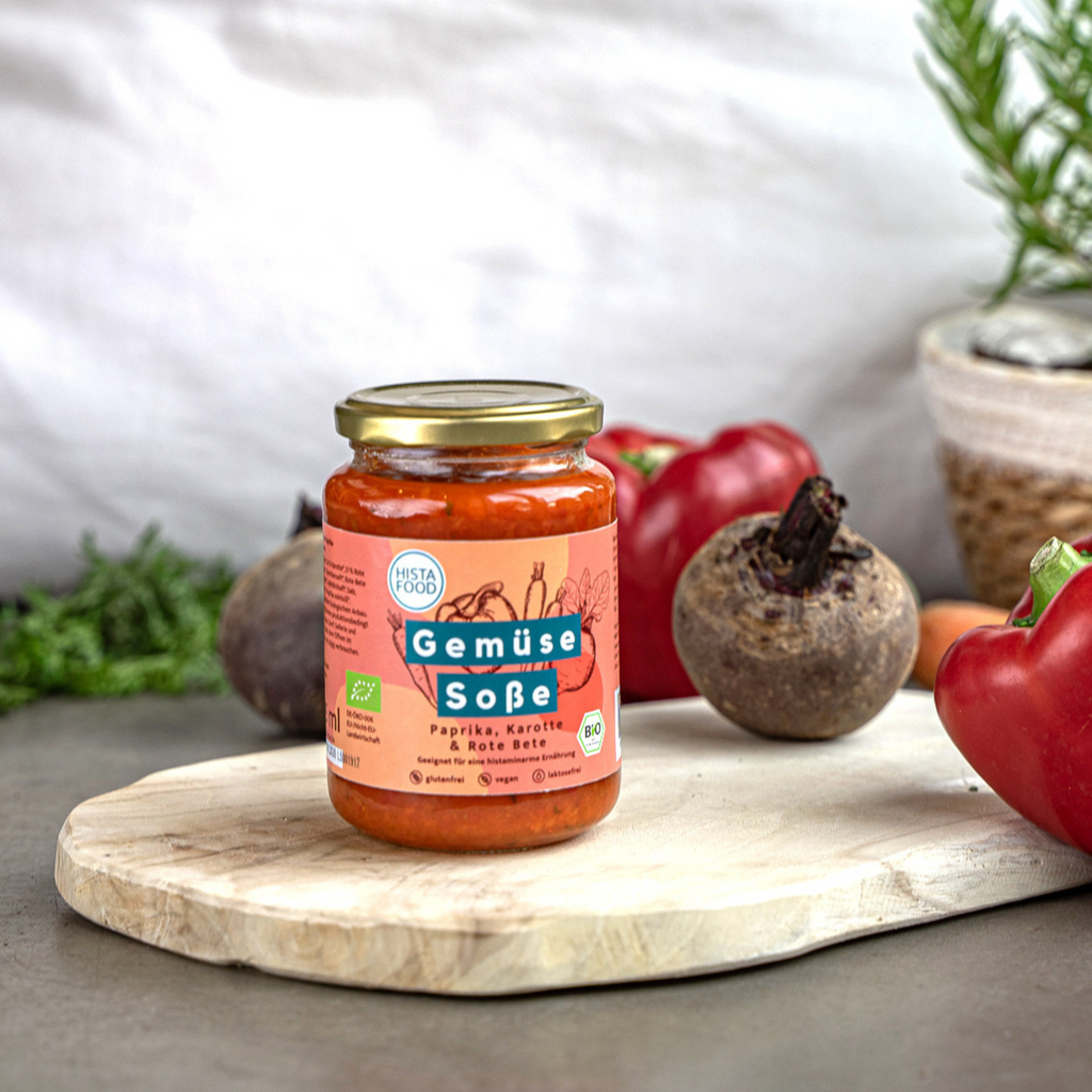 Mit der HistaFood GemüseSoße erhältst du endlich eine verträgliche Alternative zu histaminreichen Lebensmitteln. Und dabei musst du nicht auf exzellenten Geschmack und feinste Zutaten verzichten: Die reichhaltige Soße kommt in bester Bioqualität und mit fruchtiger Paprika, saftiger Karotte sowie feiner Rote Bete.