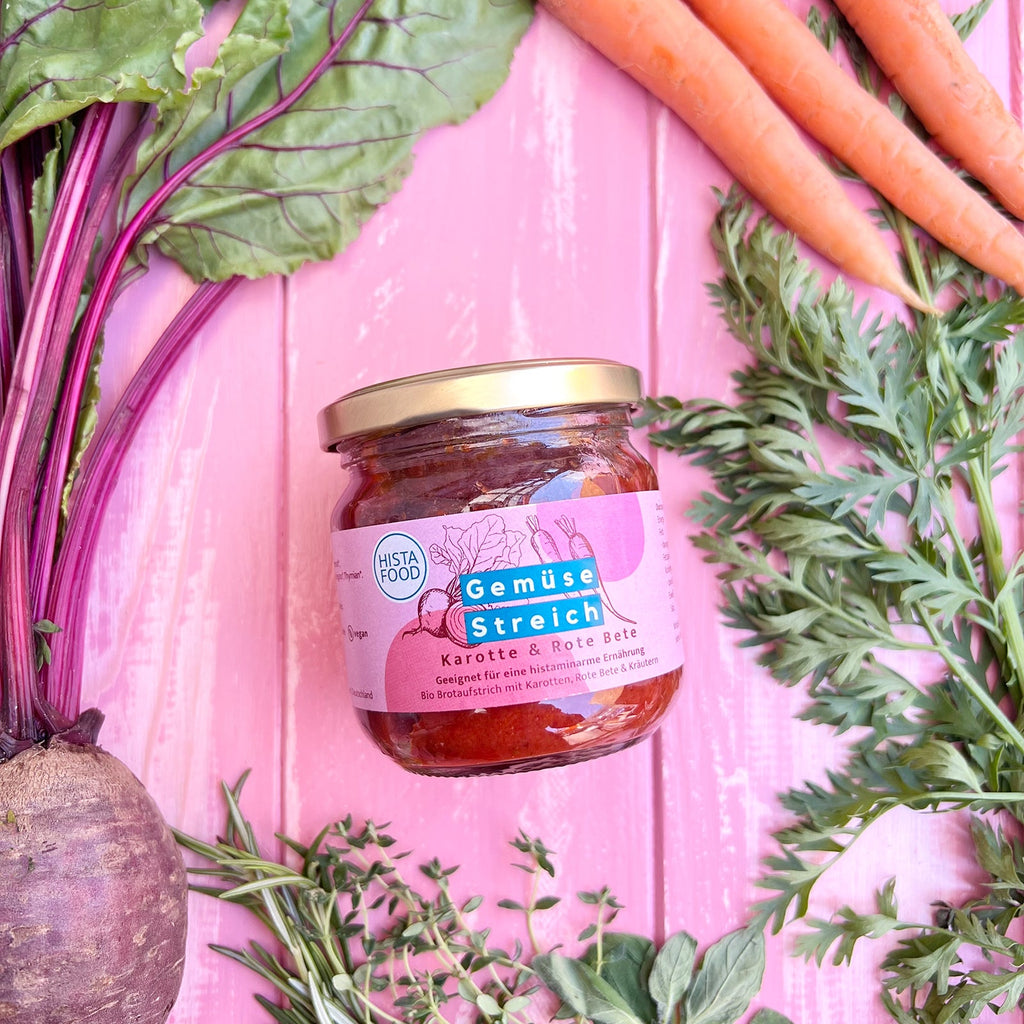 Mit dem HistaFood GemüseStreich erhältst du endlich eine verträgliche Alternative zu histaminreichen Lebensmitteln. Und dabei musst du nicht auf exzellenten Geschmack und feinste Zutaten verzichten: Der reichhaltige Brotaufstrich kommt in bester Bioqualität und mit saftigen Karotten, feiner Rote Beete und würzigen Kräutern.