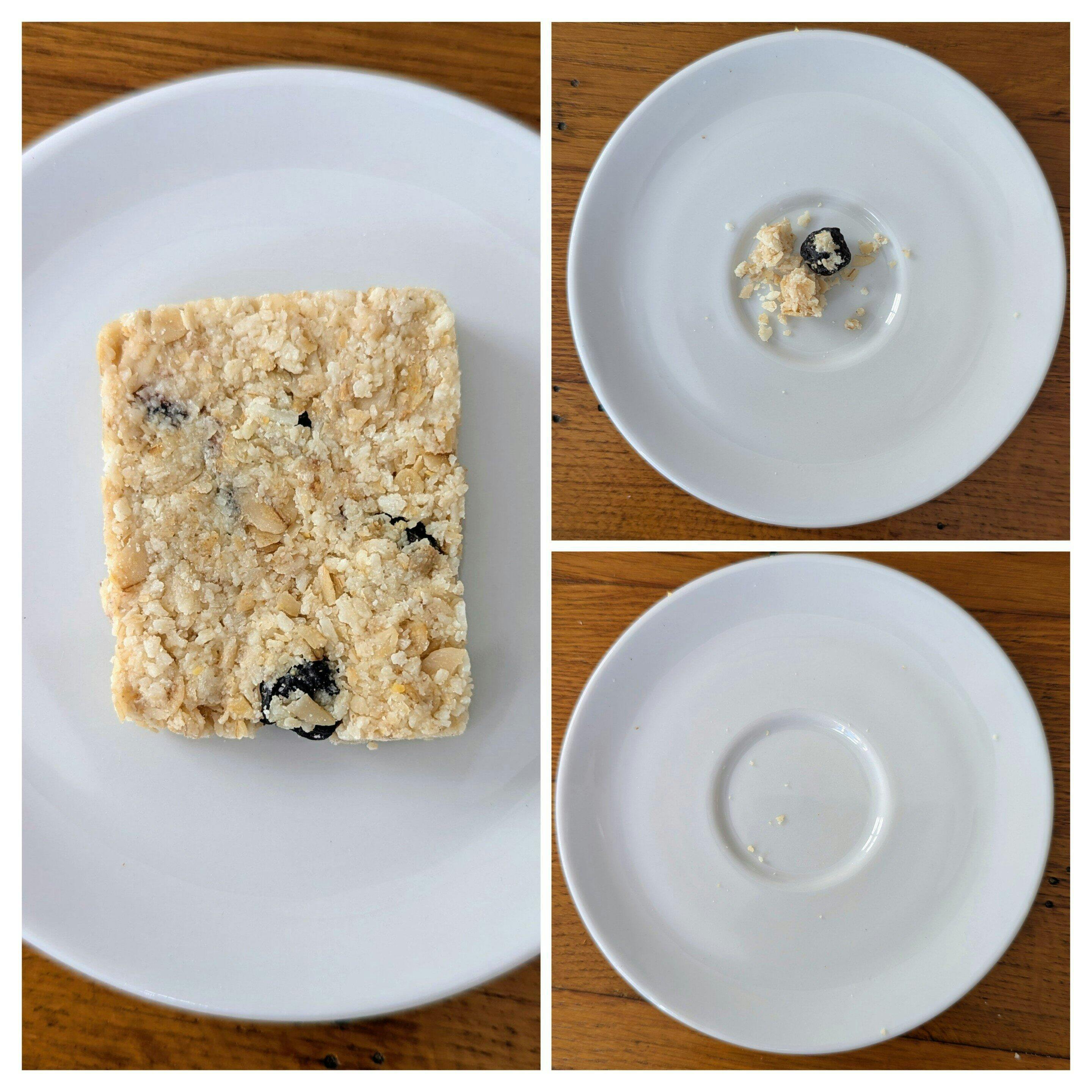 Haferflocken glutenfrei 32% *, Kokosraspeln* 25%, Reissirup*, getrocknete Blaubeeren 13%* (Blaubeeren, Zucker), Kakaobutter*, Meersalz. *Aus kontrolliert biologischem Anbau.