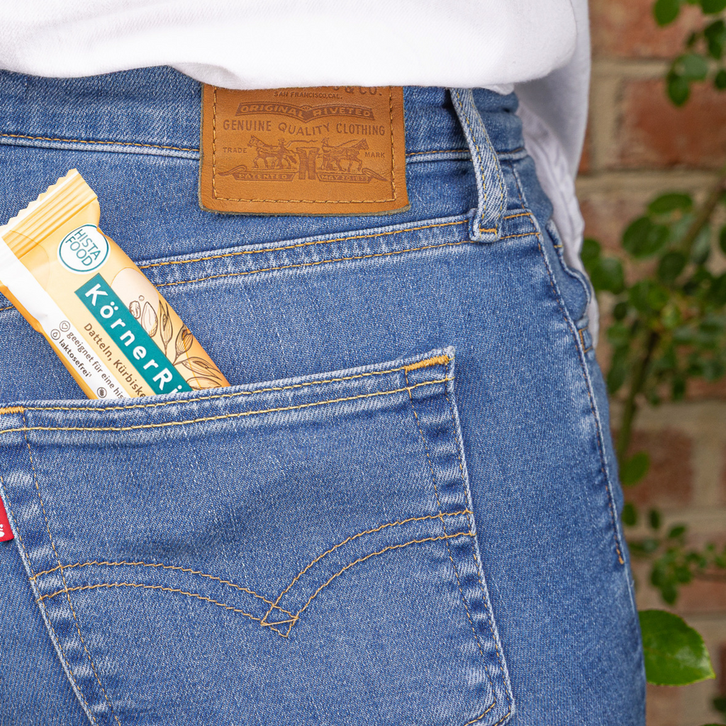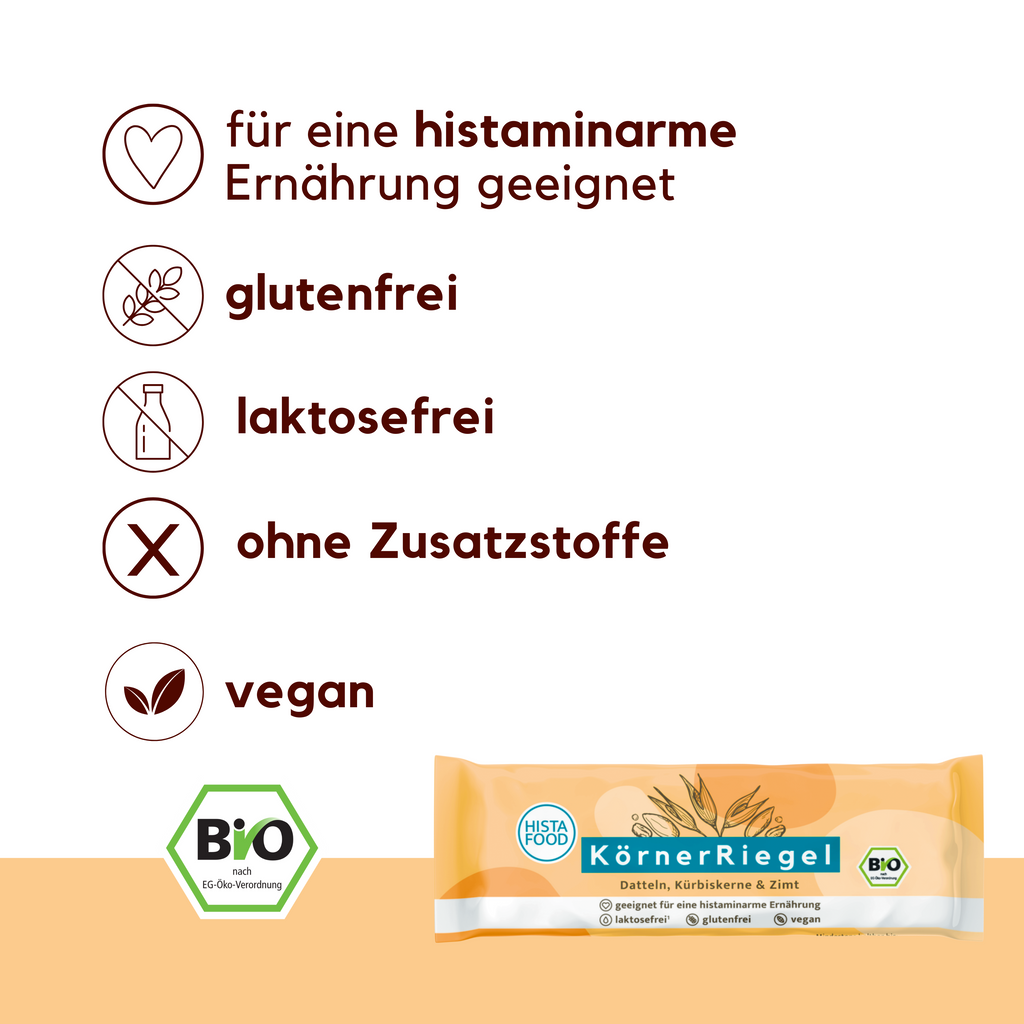 Der HistaFood KörnerRiegel kommt in bester Bio-Qualität und mit kernigen Vollkornhaferflocken, saftigen Datteln, Kürbiskernen, Hanfsamen sowie einer angenehmen Zimt-Kardamom-Note daher. So hat du immer einen zuverlässigen Snack gegen den kleinen Hunger in der Tasche.