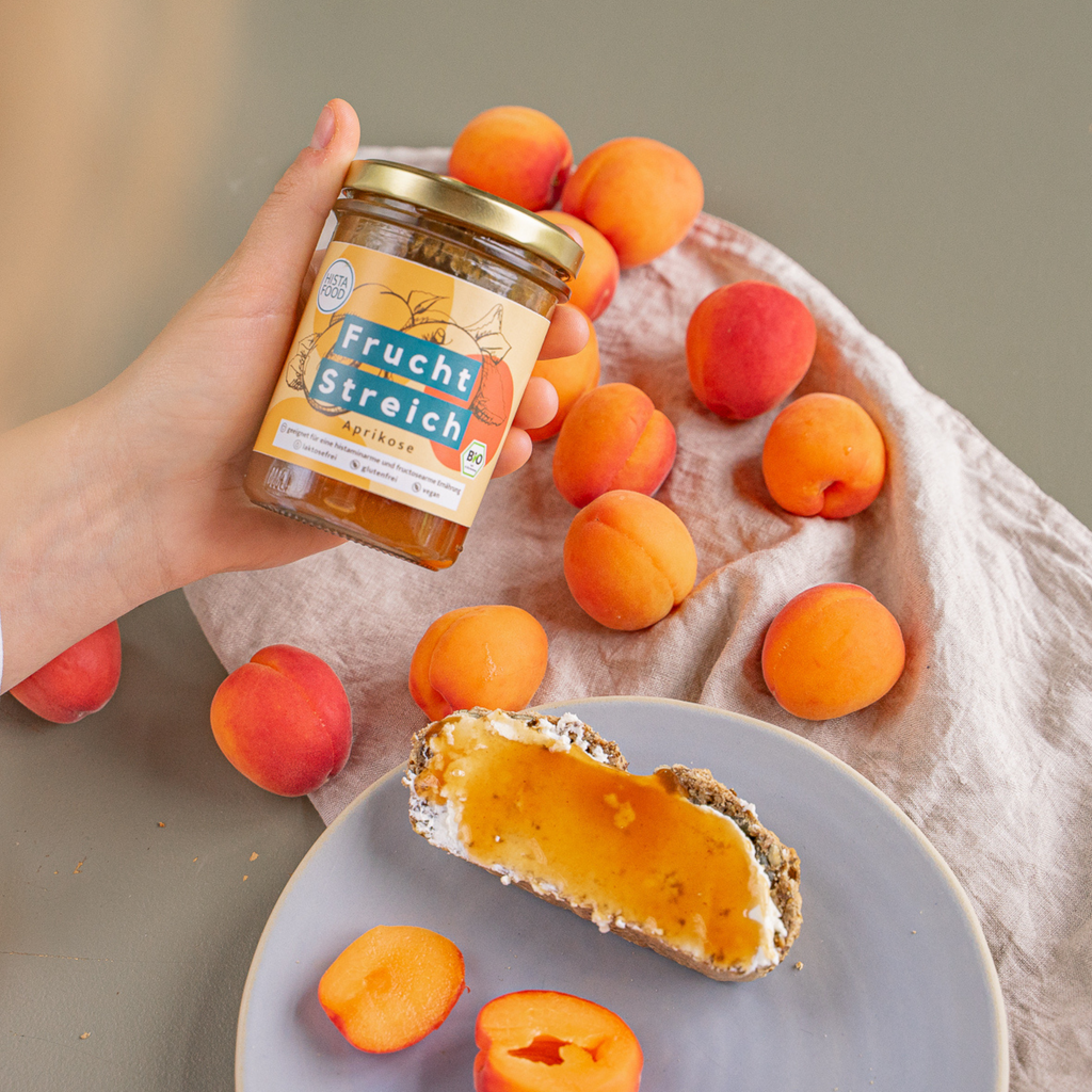 Bio FruchtStreich Aprikose: Fruchtig-süß, ohne künstliche Zusätze – für alle, die den süßen Genuss lieben. Schmeckt köstlich auf Brot, als Topping oder auch zu Pfannkuchen.