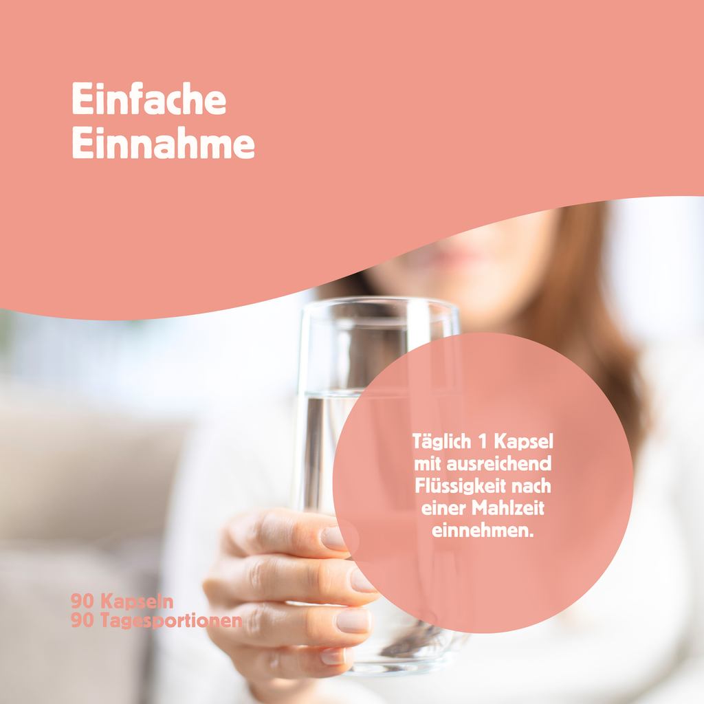 ✔ Einnahmeempfehlung: Täglich eine Kapsel nach einer Mahlzeit mit ausreichend Flüssigkeit einnehmen