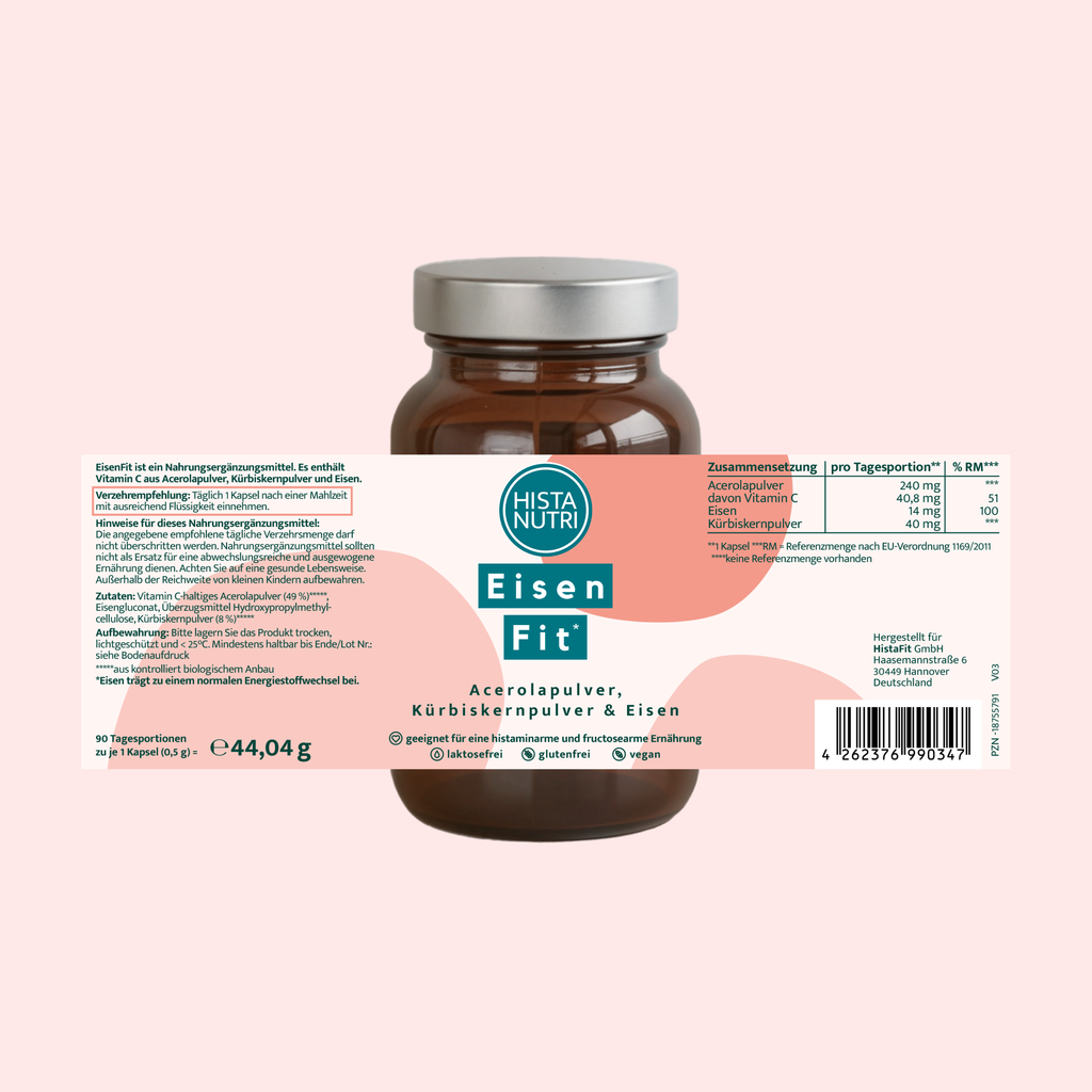 ✔ 14 mg Eisen plus Vitamin C & Kürbiskernpulver pro Kapsel
