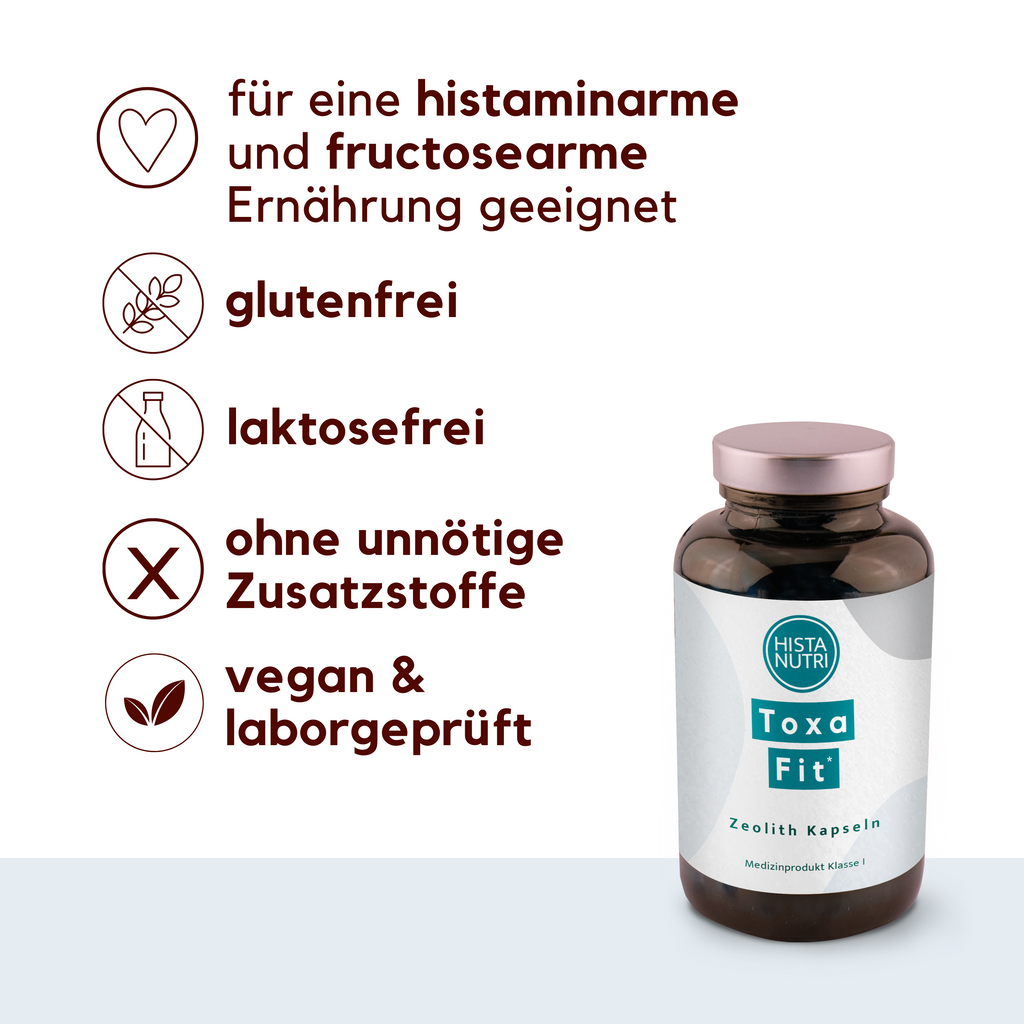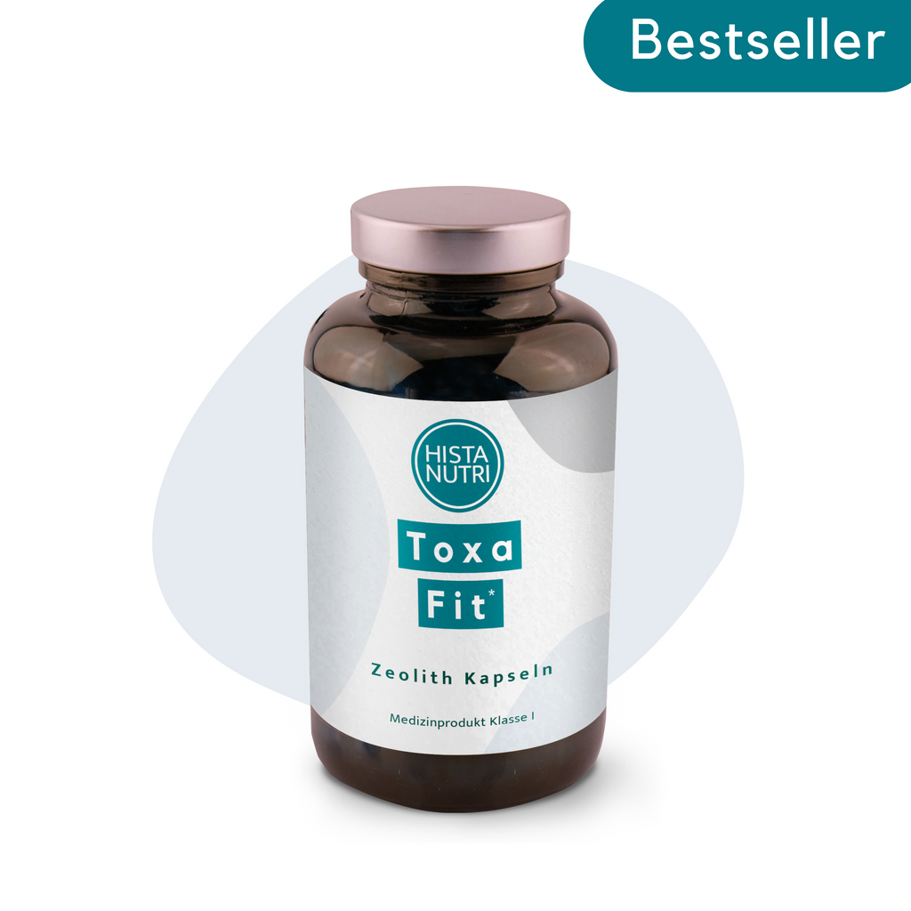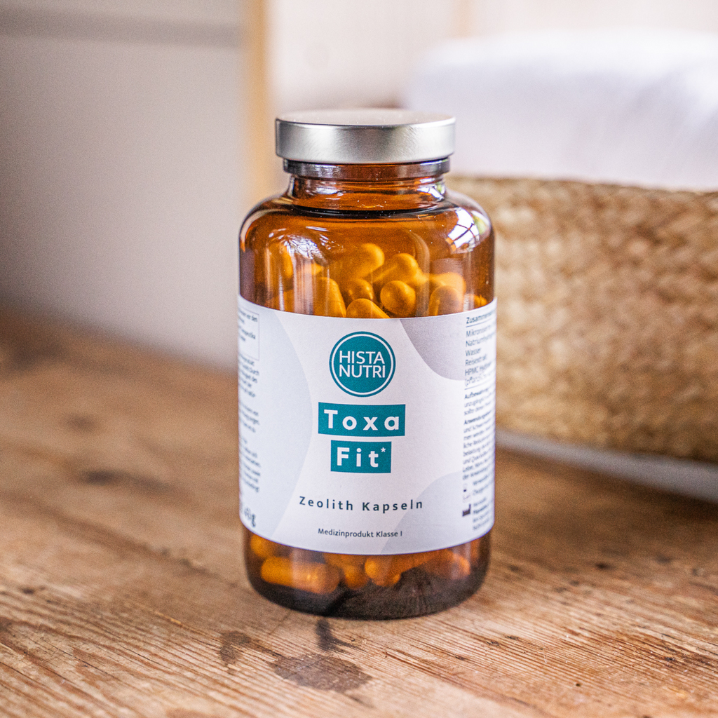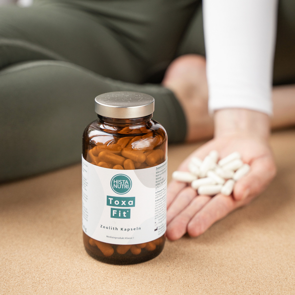 HistaNutri ToxaFit enthält mikronisierten Zeolith (Klinoptilolith), ein natürliches Mineral, das Ammonium und Schwermetallionen aus der Nahrung bindet. Nach der Einnahme mit Flüssigkeit adsorbiert der Zeolith diese Stoffe im Verdauungstrakt und transportiert sie auf natürlichem Wege aus dem Körper. Dadurch wird der Stoffwechsel von Leber, Niere, Bauchspeicheldrüse und Blut entlastet.