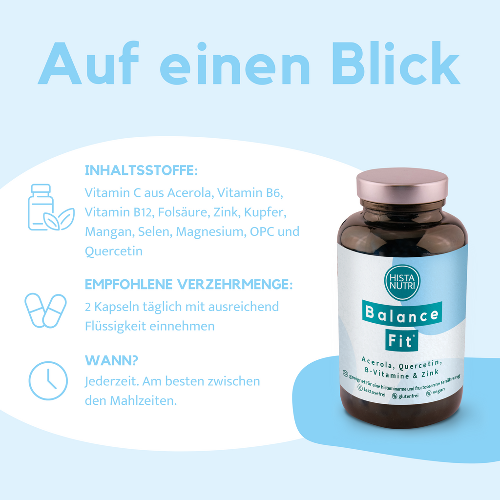 BalanceFit: Vitamin C-haltiges Acerolapulver (29,2 %), Traubenkernpulver, Überzugmittel Hydroxypropylmethylcellulose, Magnesiumbisglycinat, Quercetin (8,6 %), Mangangluconat, Natriumselenit, Zinkcarbonat, Kupfergluconat, Pyridoxal-5-Phosphat, Methylcobalamin, (6S)-5-Methyltetrahydrofolsäure-Glucosaminsalz
